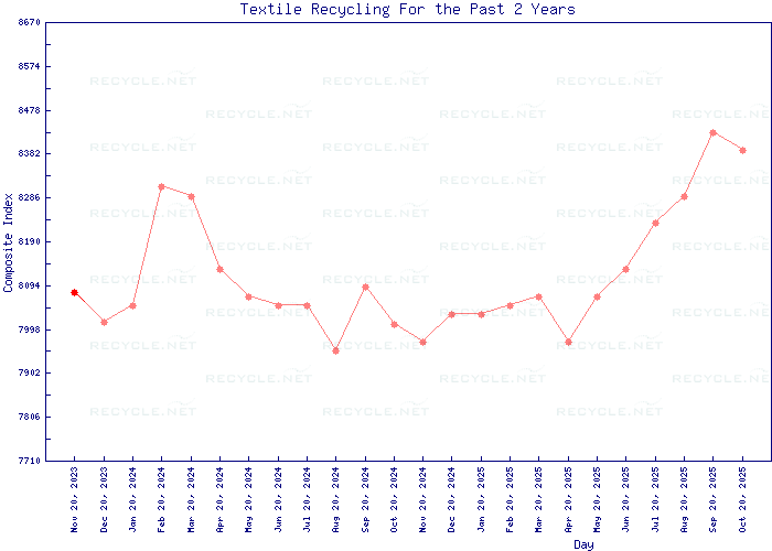 The Textile Recycling Composite Index tracks the changing market prices in the textile recycling industry . The Index consists of a weighted basket of specific benchmark grades of recovered natural textile fibers, scrap synthetic textiles and used apparel items. The Index includes snapshots of 5 viewpoints of market trends : the past 7 days, past 30 days, past 90 days, past 1 year and past 2 years.